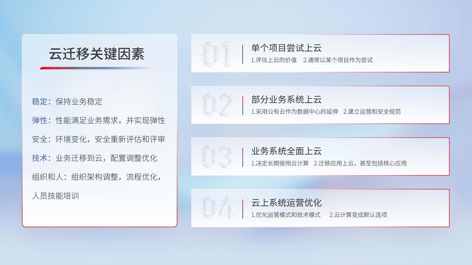 结合实际业务,,,从规划设计、、、云平台选型、、、、云原生改造、、、、数据迁移、、、、集成交付,,,迁移全过程为客户识别最佳上云路径,,,,做好风险识别管理,,,设计网络架构、、身份权限、、安全审计合规、、、、操作审计、、、日志审计、、、、监控告警策略、、、、多站点容灾设计等,,对云上基础设施进行整体规划,,,提升IT治理水平,,以满足弹性、、、、高可用、、、高性能的需求。。。